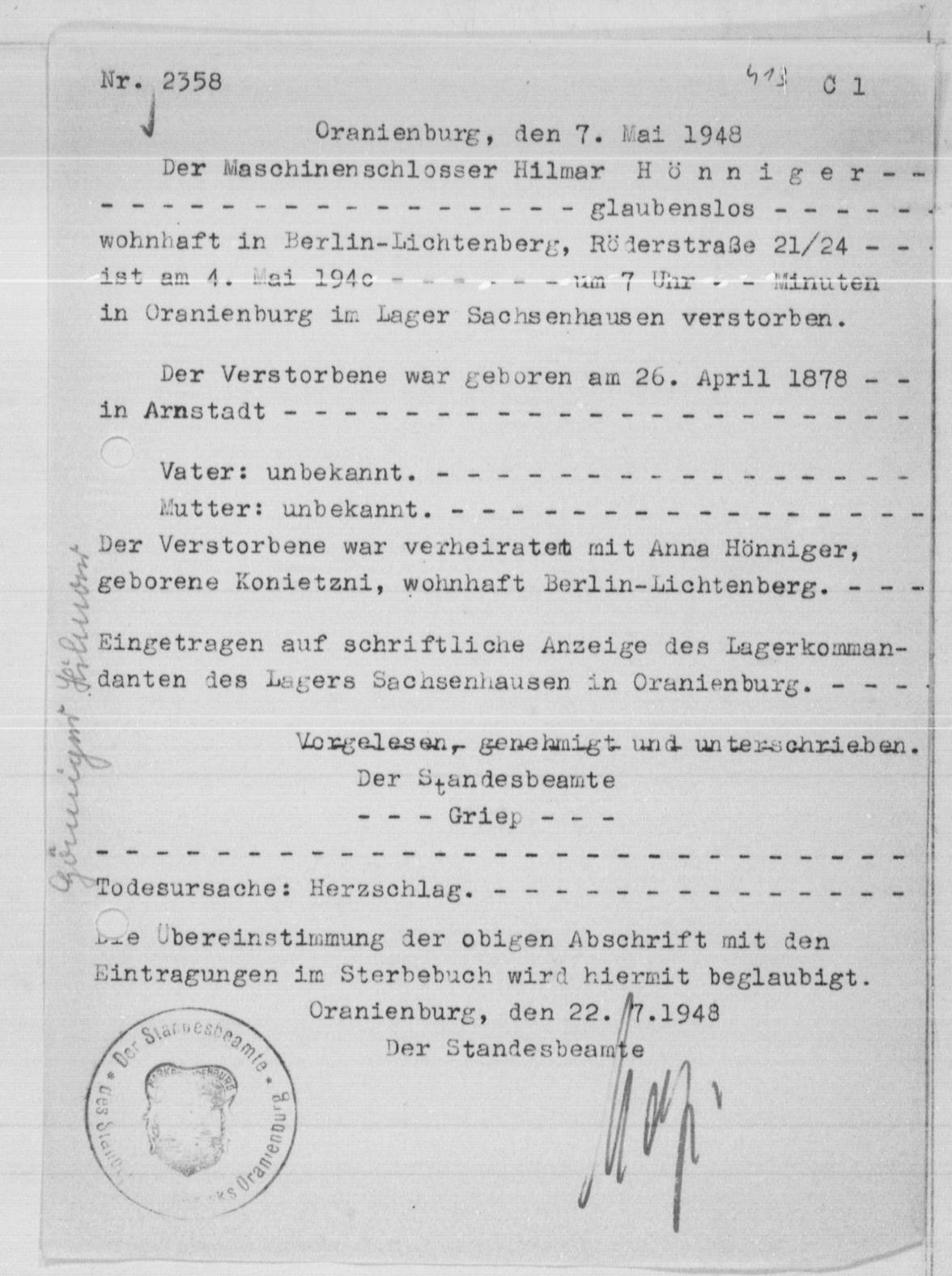 Quellen: • KZ Sachsenhausen 1936 - 1945: 〉 Internet-Totenbuch • Arolsen Archives, Sterbebucheintragungen über verstorbene Häftlinge des Konzentrationslagers Sachsenhausen 〉 DocID 4119843 • Arolsen Archives, Zu- und Entlassungslisten, Transportlisten sowie Namenverzeichnisse des Zuchthauses und der Sicherungsanstalt Brandenburg-Görden, Entlassungen im Monat März 1940 〉 DocID 12117282 • Hilmar Hönniger in der Sammlung Adressbücher aus Deutschland und Umgebung, 1815-1974, Beruf Straßenwärter, Dörnfeld a. Ilm: 〉 ancestry.de • Osmar Hilmar Alfred Hönniger in der Sammlung Berlin, Deutschland, Heiratsregister, 1874-1936 Mutter: Anna Marie Theodore Hönniger, Heirat am 23.04.1900; Berlin VII A, Ehepartnerin: Julianna Koniezny 〉 ancestry.de |
