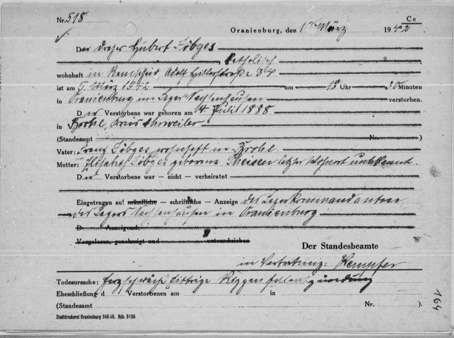 Quellen: • KZ Sachsenhausen 1936 - 1945: 〉 Totenbuch • Arolsen Archives, Sterbebucheintragungen über verstorbene Häftlinge des Konzentrationslagers Sachsenhausen DocID 10010439 • Arolsen Archives, Karteikarten vom Amt für die Erfassung von Kriegsopfern, Berlin 〉 DocID 23120001 • Arolsen Archives, Namenliste über verstorbene Häftlinge des Konzentrationslagers Sachsenhausen, deren Urnen auf dem Waldfriedhof Güterfelde beigesetzt wurden - Urnen # 4540 〉 DocID 10010470 |