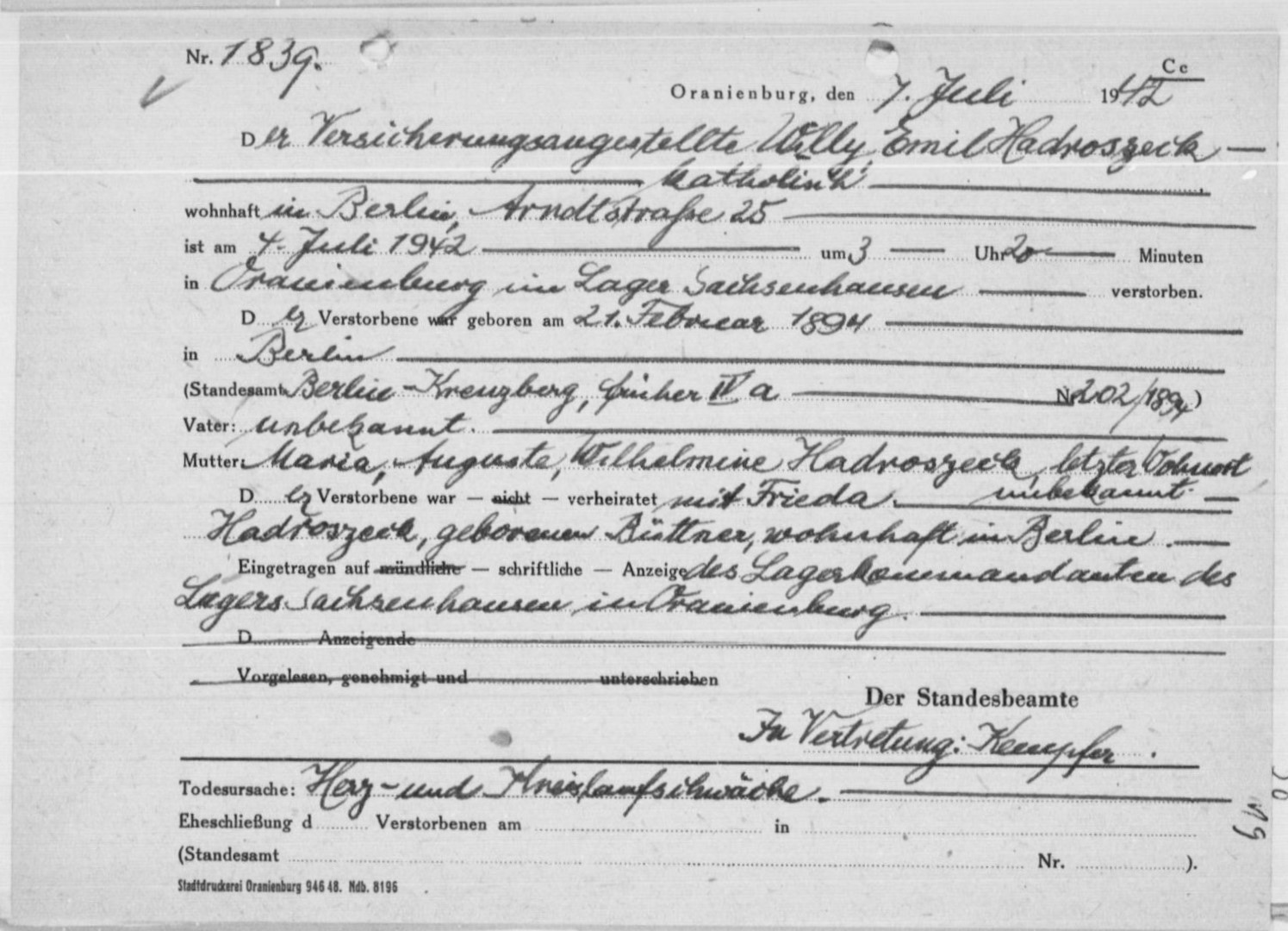 Seine letzte Adresse in Berlin war von 1939 bis 1942 die Arndtstraße 25 in Kreuzberg, wo er als Versicherungsbeamter gemeldet war. Bereits im Jahr 1938 war seine Mutter im Alter von 73 Jahren verstorben. Die zweite Ehefrau von Willy Hadroszek überlebte den Krieg und lebte noch bis in die 1980 Jahre in der Kreuzberger Blücherstraße, bevor sie 1982 verstarb. |