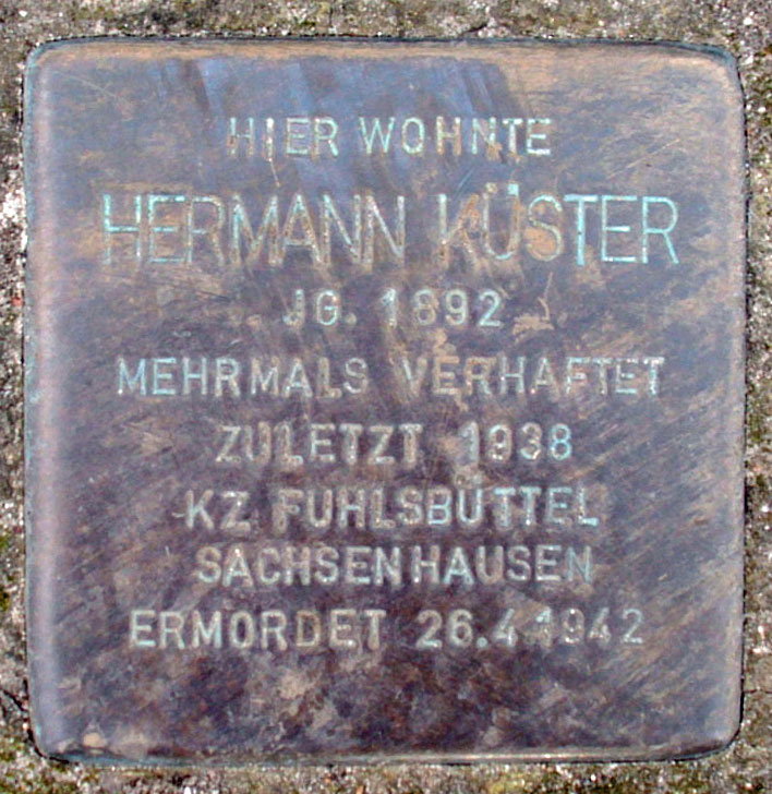 Zuletzt wohnte er bei seiner Schwester im Eidelstedter Weg 25 im zweiten Stock, früher Hausnummer 85, ... 1938 traf Theodor Gehring Hermann Küster zufällig in der Bismarckstraße wieder, wo er gegen Zahlung von 2 RM in einem Treppenhaus mit ihm onanierte. Nach seiner ersten Vernehmung im Stadthaus wurde Hermann Küster erneut ins das KZ Fuhlsbüttel eingesperrt. Die darauffolgenden zehn Tage wurde er zu mehreren Verhören jeweils in der Stadthausbrücke gebracht, wo er nach "eindringlichen Ermahnungen", die auch als Chiffren für die Anwendung körperlicher Misshandlungen zu deuten sind, vor dem Kriminaloberassistenten Voigt ein umfangreiches Geständnis ablegte. In der Folge wurde Hermann Küster im Dezember 1938 vor dem Schöffengericht zu einer zweijährigen Gefängnisstrafe verurteilt. Eindringlich empfahl man dem Angeklagten "vom Richtertisch in Übereinstimmung mit der Staatsanwaltschaft", sich "freiwillig entmannen" zu lassen. Einem solchen gravierenden gesundheitlichen Eingriff hatte er während seiner Haftzeit, die er bis zum 21. Oktober 1940 in Fuhlsbüttel verbüßte, nicht zugestimmt. Möglicherweise war das auch der Grund, warum er einen Tag später statt in Freiheit zu kommen der Polizei übergeben wurde. Jedenfalls muss davon ausgegangen werden, dass er nicht wieder in Freiheit gelangte, sondern wahrscheinlich nach einem Aufenthalt im Polizeigefängnis Hütten, für das es keine Überlieferung der Inhaftierten gibt, in das KZ Sachsenhausen überstellt wurde. Anhand der Häftlingsnummer 35060 ist nachgewiesen, dass er dort im Januar 1941 eingeliefert worden sein muss. Aus diesem Monat datiert auch der erste Nachweis im Lager als "B. V. 175" (nach § 175 verurteilter "Berufsverbrecher"). Hermann Küster wird in Sachsenhausen bald erkrankt sein, da er bereits am 19. Januar 1941 in den dortigen Krankenbau verlegt wurde. Weitere Einlieferungen datieren vom 10. März und 8. Mai. Sein letzter Aufenthalt dort dauerte bis zum 23. Juli. Doch schon am 12. August wurde er wieder eingeliefert und verblieb bis 1. Dezember 1941 im Krankenbau. Schließlich wurde sein Tod am 26. April 1942 um 8.50 Uhr im KZ Sachsenhausen mit der offiziellen Todesursache "Herzschwäche" nach einer "Bronchopneumonie" beim Standesamt Oranienburg beurkundet. Sein Denunziant Theodor Gehring wurde am 9. Juli 1942 hingerichtet (s. Biographie Henry Heitmann). Ausführlicher: Wir erinnern an Hermann Küster (pdf) |