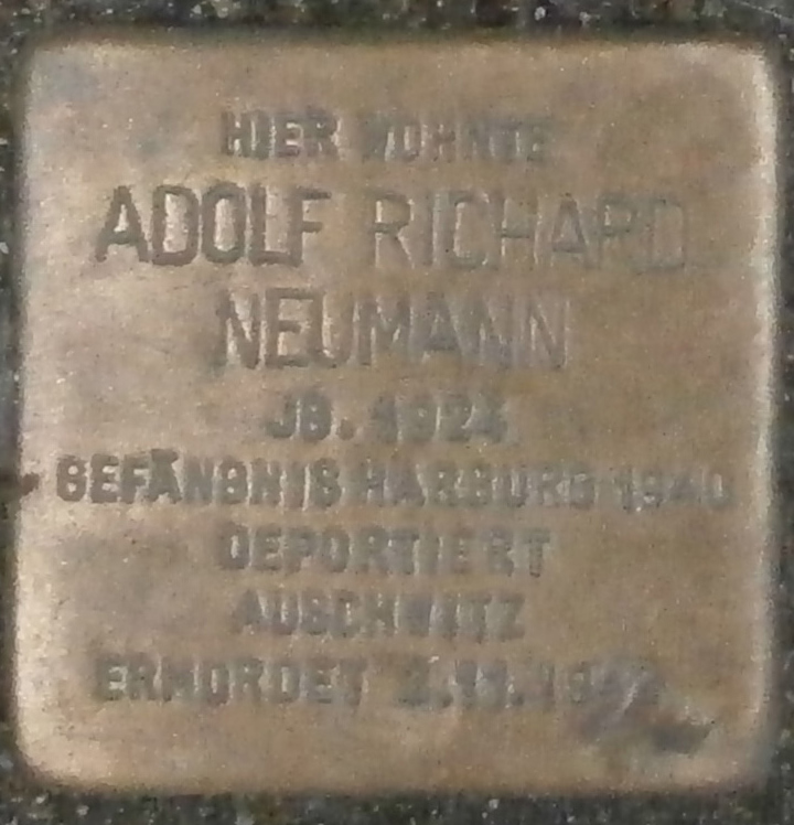 »Adolf richard israel Neumann wurde im Jahr 1924 in Hamburg, Deutsches Reich geboren. Er war der Sohn von Moritz und Sophie, geb. London. Während des Krieges war er in Altona, Deutsches Reich.Aus dem Gedenkbuch 〉 Opfer der Verfolgung der Juden unter der nationalsozialistischen Gewaltherrschaft in Deutschland 1933-1945: »Neumann, Adolf Richard Adolph geboren am 09. Oktober 1924 in Hamburg / - / Hansestadt Hamburg 🔎 Gedenkblatt Adolf Richard Neumann In Hamburg ehrte man ihn und seine Familie mit Stolpersteinen 〉 204595 Hamburg, Alter Steinweg 13 Sein Partner Kurt Dombeck3 wurde nach seiner Strafhaft im Gefängnis Wolfenbüttel am 28. April 1943 im KZ Neuengamme ermordet. Siehe Eintrag in das 〉 Internet-Totenbuch KZ Gedenkstätte Neuengamme. Auch für Kurt Dombeck wurde ein Gedenkbuch in Hamburg in der 〉 Brüderstraße 3 gesetzt. |