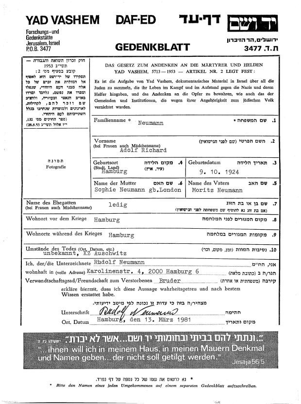 Adolf Richard Neumann wurde am 9. Oktober 1924 in Hamburg geboren. Er war jüdischer Herkunft und wurde 1938 aus der Talmut-Tora-Schule