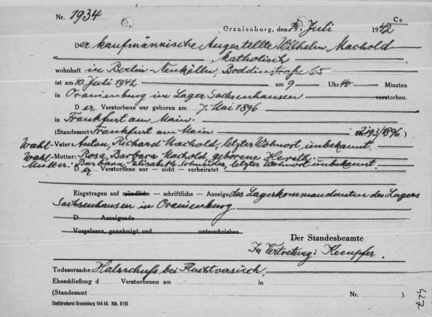 Wilhelm Machold wurde am 7. Mai 1896 als Sohn von Barbara, Elisabeth Schneider in Frankfurt am Main geboren und später