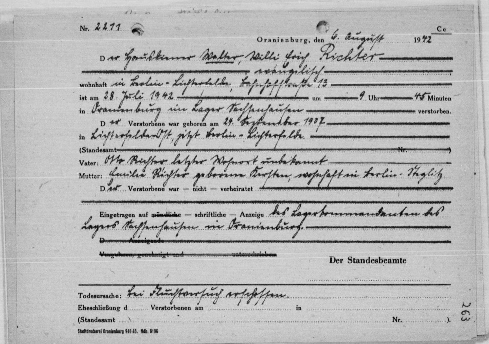 | Letzter Wohnort: | 〉 Berlin Lichterfelde, Bahnhofstraße 13 | |