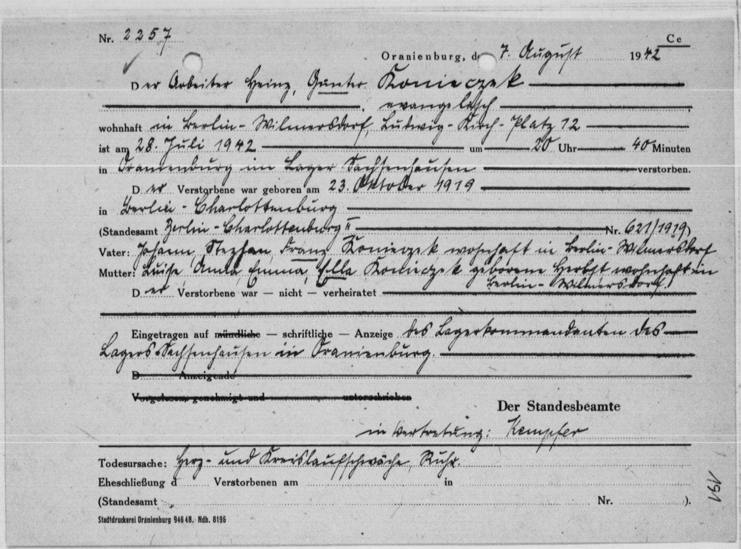 Quellen: • KZ Sachsenhausen 1936 - 1945: 〉 Internet-Totenbuch • Arolsen Archives, Sterbebucheintragungen über verstorbene Häftlinge des Konzentrationslagers Sachsenhausen 〉 DocID 4121620 • Arolsen Archives, Listenmaterial Sachsenhausen Arbeitskopien Ordner 41 〉 DocID 4083702 • Arolsen Archives, Karteikarte Amt für die Erfassung der Kriegsopfer Berlin 〉 DocID 130580970 • Müller, Joachim, Unnatürliche Todesfälle, in: Müller, Joachim, Sternweiler, Andreas, Homosexuelle Männer im KZ Sachsenhausen, Berlin 2000, S. 216 ff. |