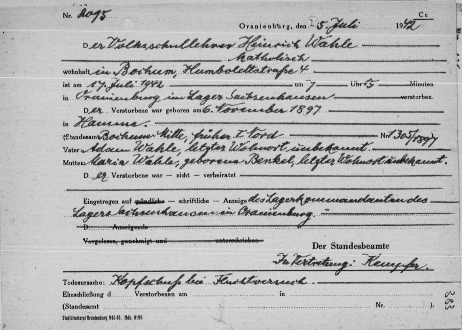 Heinrich Wahle, geboren am 6. November 1897 in Bochum-Hamme, Volksschullehrer von Beruf, lebte bis 1938 in Bochum.