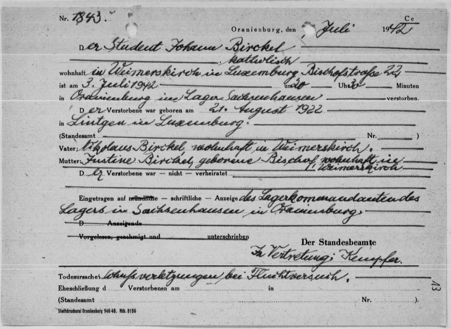 Johann Birckel oder andere Schreibweise Jean Birkel wurde am 21. August 1922 in Lintgen im Großherzogtum Luxemburg geboren