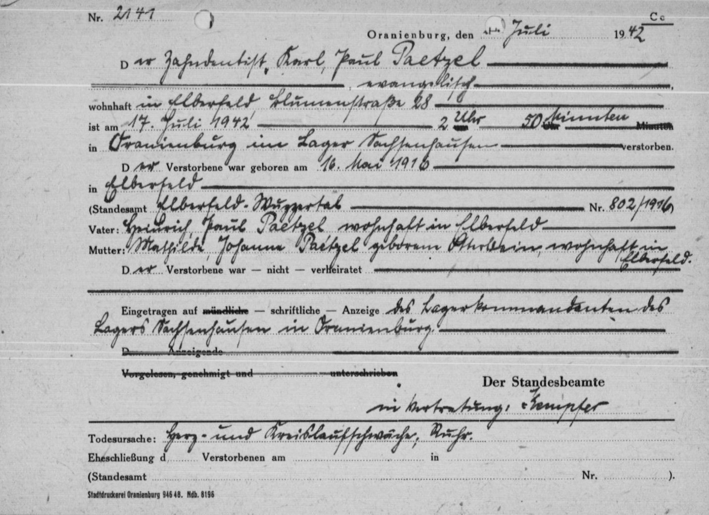 Deportation in das KZ Sachsenhausen bei Berlin. Er erhielt er als "Rosa-Winkel-Häftling" die Häftlingsnummer 42 480. Karl Paul Paetzel wurde am 17. Juli 1942 im Alter von 26 Jahren im Außenlager Klinkerwerk ein Opfer