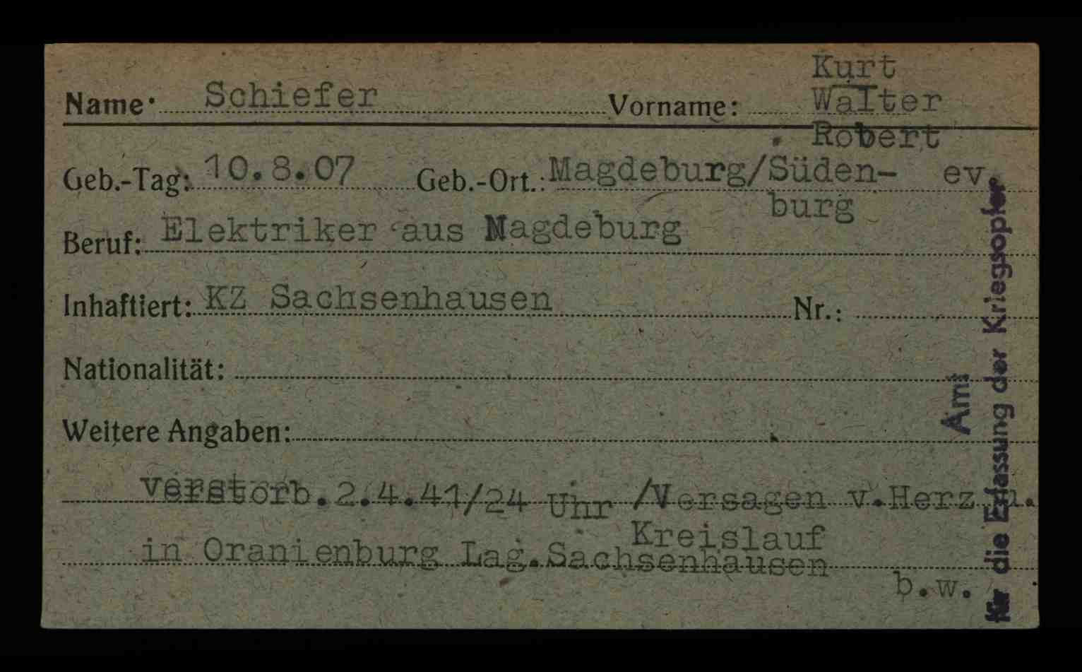Quellen: • KZ Sachsenhausen 1936 - 1945: 〉 Internet-Totenbuch • Landeshauptarchiv Staatsarchiv Magdeburg, Karteikarten, Rep. C. 144 Gefängnisse Magdeburg, Gommern und Schönebeck B Nr. 276 A-Z, 3 Karteikarten. • Arolsen Archive: Karteikarten vom Amt für die Erfassung von Kriegsopfern, Berlin DocID 23120001 272 |