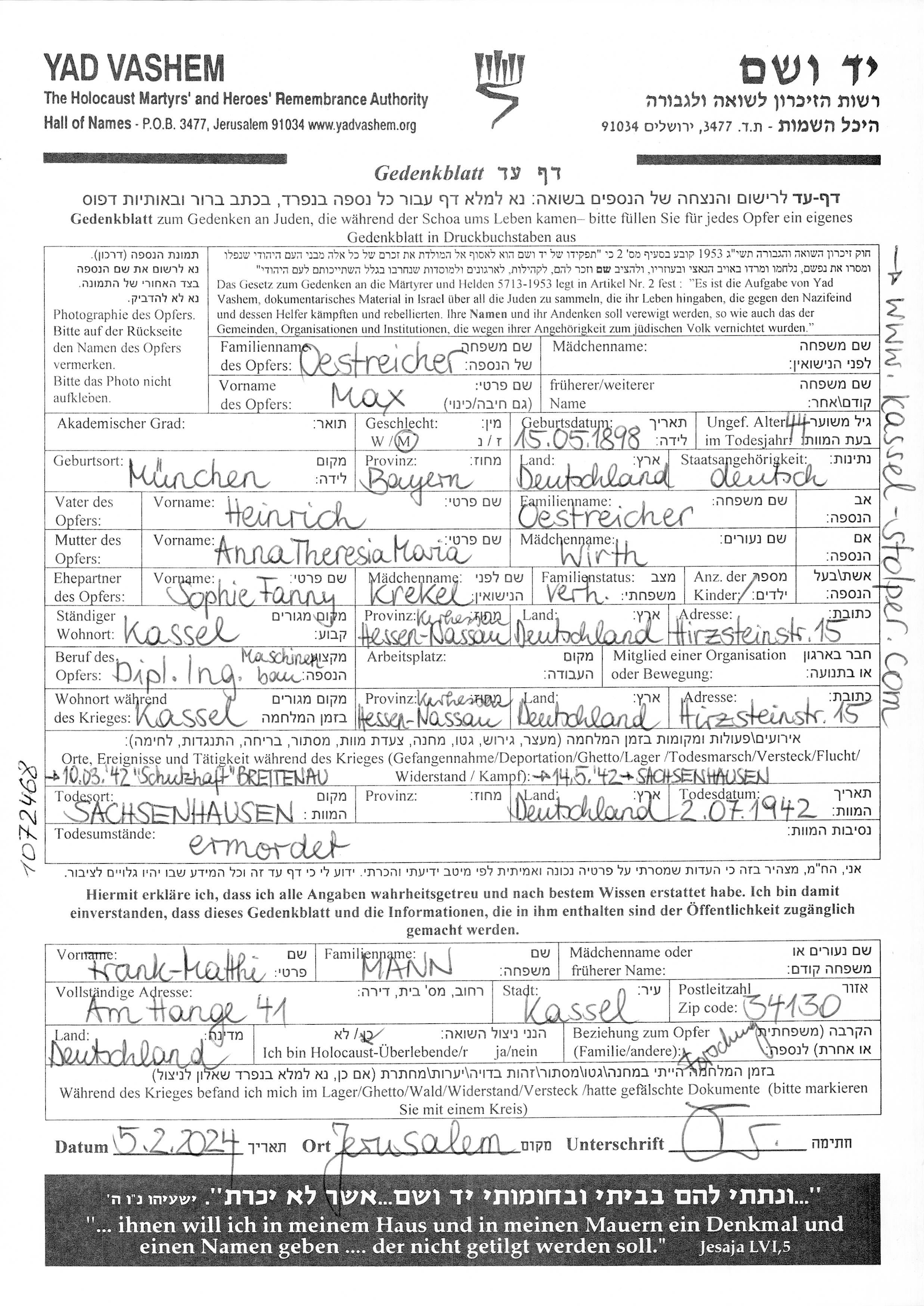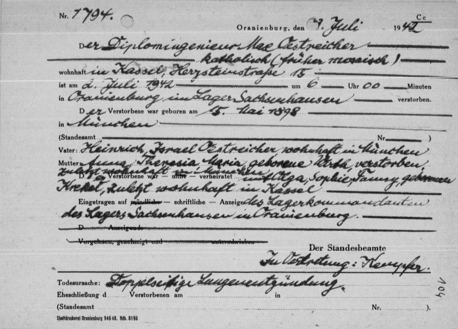 Jochen Boczkowski 〉 Stolpersteine in Kassel e.V. hat das Schicksal von 〉 Max Oestreicher.pdf und weiterer Familienangehöriger erforscht. ![]() »Max Östreicher wurde im Jahr 1898 in Muenchen, Deutsches Reich geboren. Vor dem Zweiten Weltkrieg lebte er in Kassel, Deutsches Reich. Während des Krieges war er in Sachsenhausen, Deutsches Reich.🔎 Gedenkblatt Sein jüdischer Vater Heinrich Oestreicher wurde am 12. Mai 1868 in München geboren. Er wurde am 23. Juli 1942 wurde mit dem Transport II/18 von München in das KZ/Ghetto Theresienstadt deportiert und am 15. März 1943 vom NS-Regime im 〉 KZ Theresienstadt ermordet. Für Heinrich Oestreicher liegt in der Münchener 〉 Viktor-Scheffel-Straße 19 ein Stolperstein. In Memoriam: 〉 Heinrich Oestreicher.pdf |