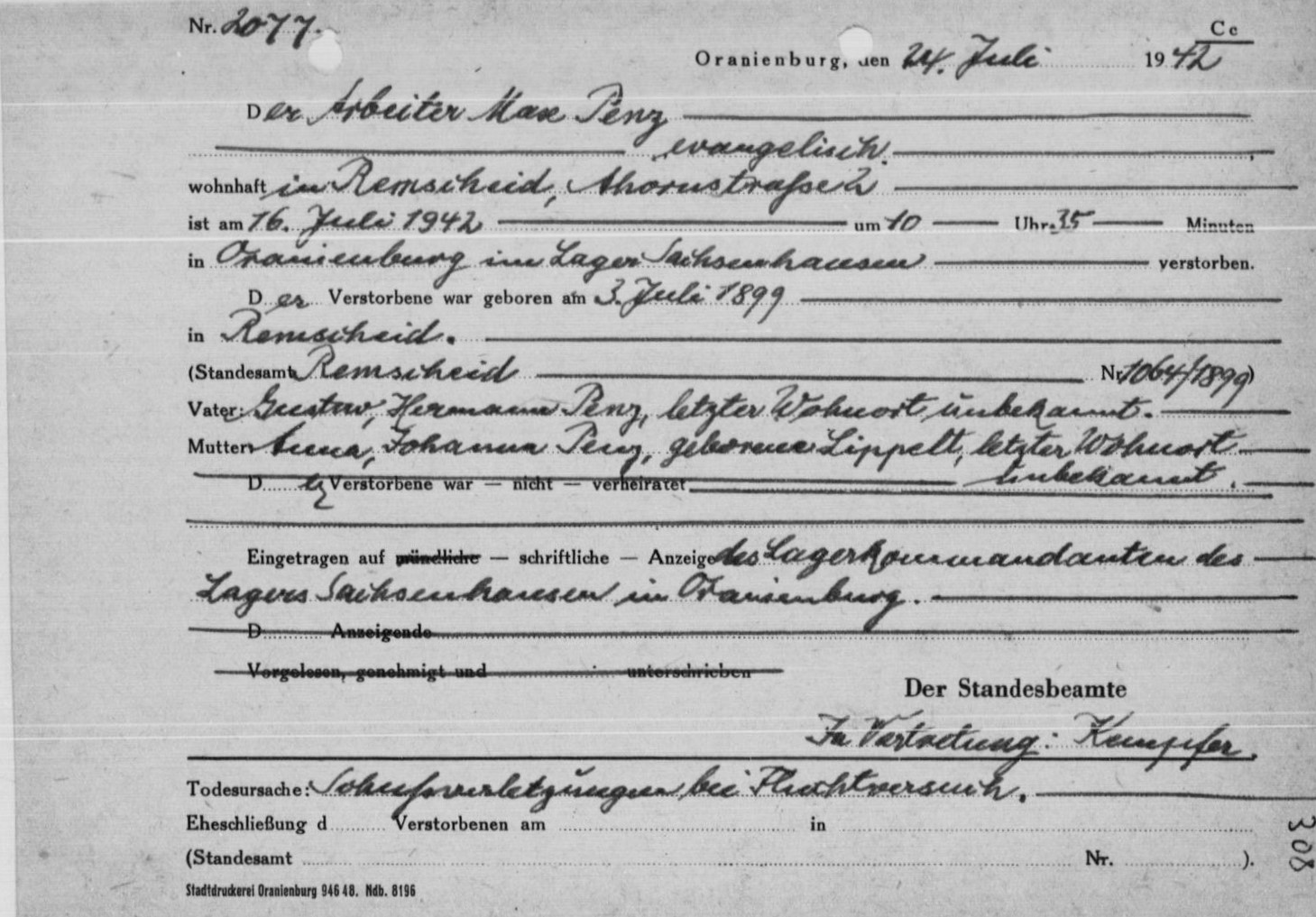 Ausführliche Biographie: 〉 Wir erinnnern an Max Penz (pdf) Heute ist bekannt, es waren mehr als 89 Häftlinge die im Klinkerwerk ermordet wurden, 114 Opfer sind uns namentlich bekannt. Ganz sicher, es waren viel mehr. Auf dieser Liste finden sich auch auch zahlreiche andere Männer aus dem Ruhrgebiet und angrenzenden Regionen und ganz Deutschland werden Opfer dieser Mordaktion, darunter: 〉 Max Penz, aus Remscheid, 〉 Otto Meinecke, aus Dortmund, 〉 Werner Bangert, aus Duisburg, 〉 Heinrich Wahle aus Bochum, 〉 Karl Paul Paetzel, aus Wuppertal. |