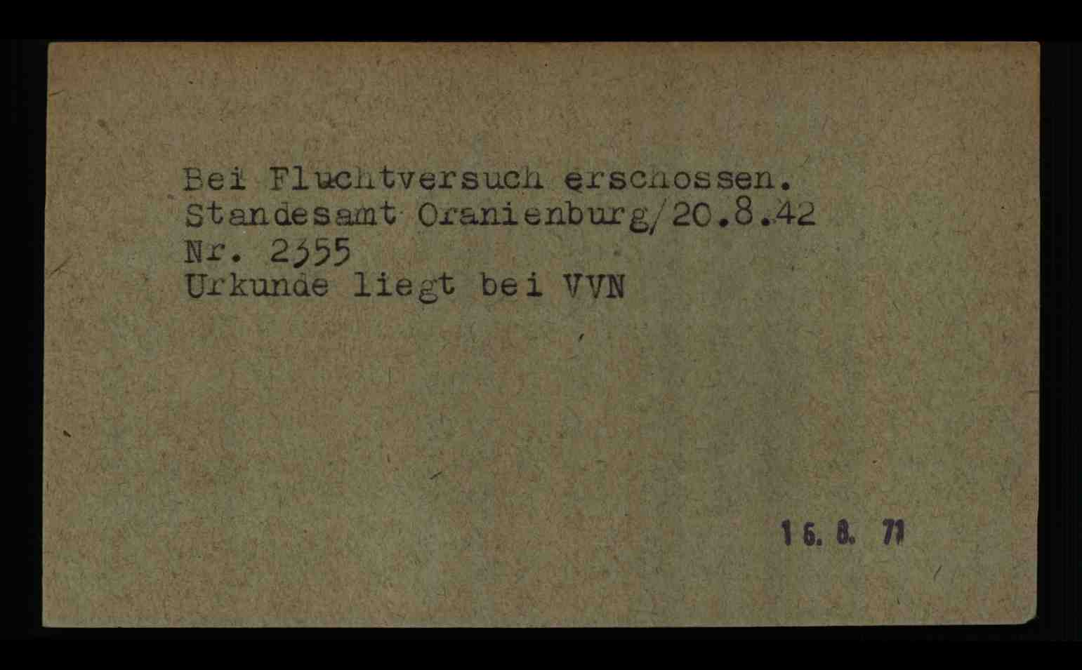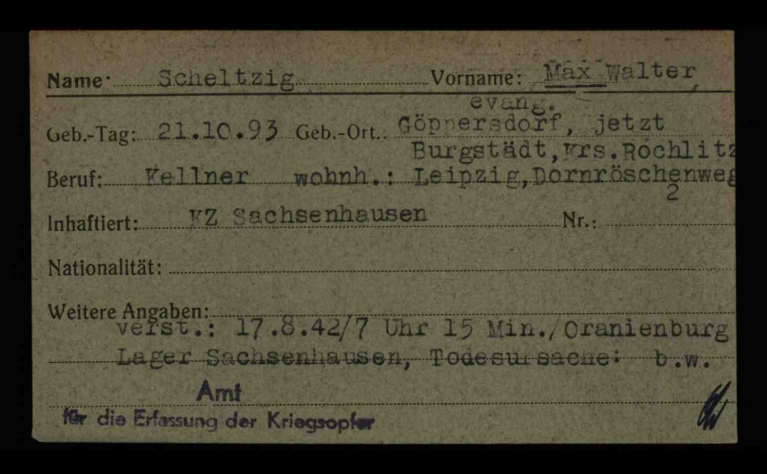 Quellen: • KZ Sachsenhausen 1936 - 1945: 〉 Internet-Totenbuch • Müller, Joachim, Unnatürliche Todesfälle, in: Müller, Joachim, Sternweiler, Andreas, Homosexuelle Männer im KZ Sachsenhausen, Berlin 2000, S. 216 ff. • Büge, Emil: Massenmord auf dem Klinker in: 1470 KZ-Geheimnisse, Heimliche Aufzeichnungen aus der Politischen Abteilung des KZ Sachsenhausen Dezember 1939 bis April 1943, Seite 149 ff., Metropol Verlag Berlin, 2010 • Arolsen Archives, Inhaftierungsdokumente Konzentrationslager Buchenwald: 〉 DocID 7026591, DocID 7026592, DocID 7026593, DocID 7026594, DocID 7026595, DocID 7026596, • Arolsen Archives, KZ Buchenwald, Veränderungsmeldung 01.01.1942, Zugang am 31.12.1941: 〉 DocID 5280692 • Arolsen Archives, KZ Buchenwald, Veränderungsmeldung 02.01.1942: Der "BV Scheltzig, Max" wird ab 02.01.1942 "Rosa-Winkel-Häftling". 〉 DocID 5280706 • Arolsen Archives, KZ Buchenwald, Namenlisten für Häftlinge mit Effekten aus Transport von Konzentrationslager Buchenwald nach Konzentrationslager Ravensbrück – 13.03.1942 〉 DocID 129641609 • Arolsen Archives, Karteikarten Amt für die Erfassung der Kriegsopfer Berlin 〉 DocID 130559948, DocID 130641572 • Sächsisches Staatsarchiv Leipzig: Auszüge aus Gefangenenbüchern des Polizeigefängnisses Leipzig, Namenverzeichnisse der Untersuchungshaftanstalt I Leipzig 1939 - 1940 Namenverzeichnisse der Untersuchungshaftanstalt II Leipzig 1939 - 1940 • Archiv KZ Buchenwald, 〉 Auskunft zu K-Häftling Scheltzig, Max, Walter, 07.10.2025 |