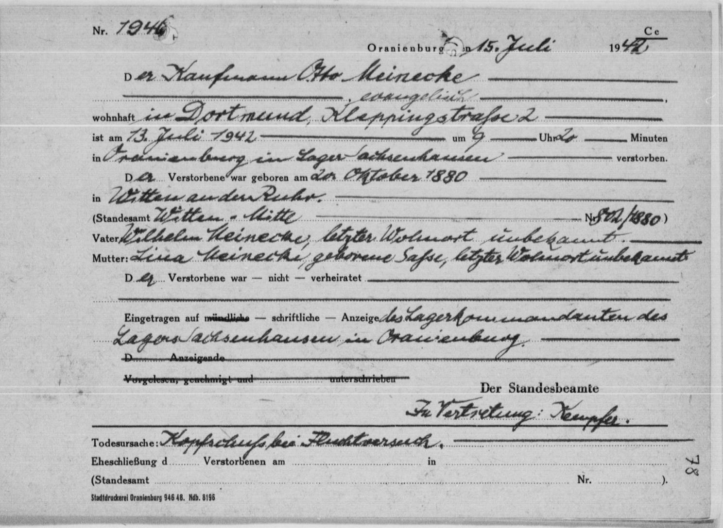 Otto Meinecke, geboren am 20. Oktober 1880 in Witten an der Ruhr, Fabrikant und Kaufmann von Beruf, wohnhaft 1940 in Dortmund, Kleppingstraße 2,