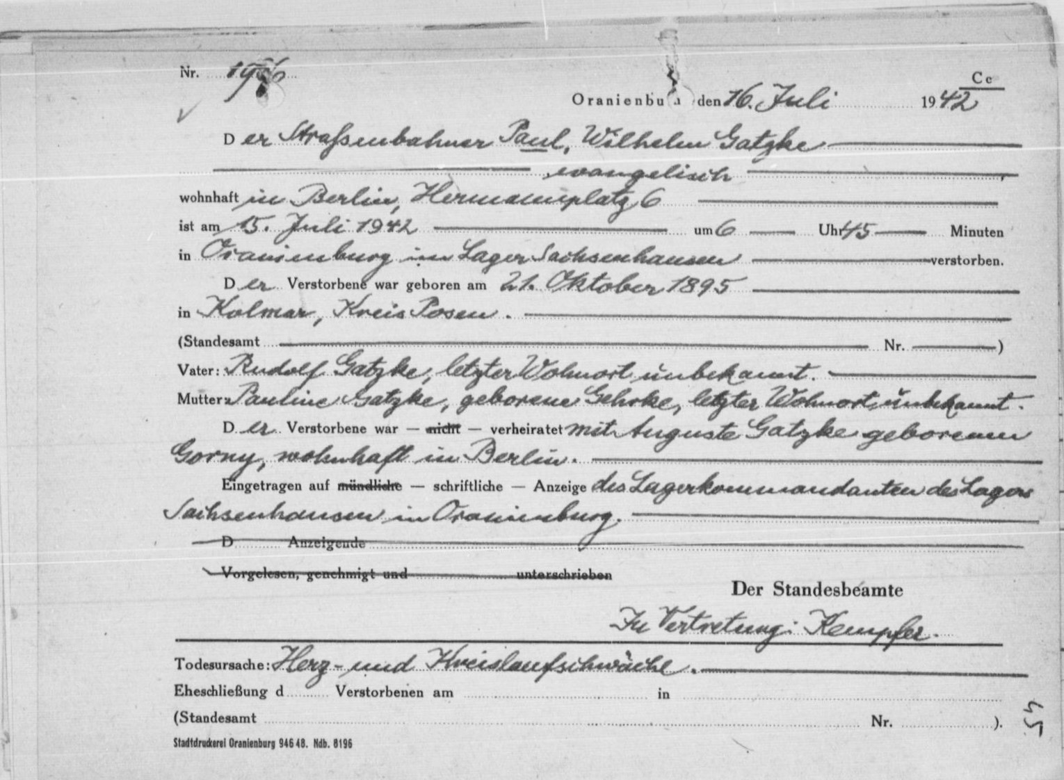 Quellen: • KZ Sachsenhausen 1936 - 1945: 〉 Internet-Totenbuch • Arolsen Archives, Sterbebucheintragungen über verstorbene Häftlinge des Konzentrationslagers Sachsenhausen 〉 DocID 4118115 • Arolsen Archives, Karteikarte Amt für die Erfassung der Kriegsopfer Berlin 〉 DocID 130599896 • Müller, Joachim, Unnatürliche Todesfälle, in: Müller, Joachim, Sternweiler, Andreas, Homosexuelle Männer im KZ Sachsenhausen, Berlin 2000, S. 216 ff. • Büge, Emil: Massenmord auf dem Klinker in: 1470 KZ-Geheimnisse, Heimliche Aufzeichnungen aus der Politischen Abteilung des KZ Sachsenhausen Dezember 1939 bis April 1943, Seite 149 ff., Metropol Verlag Berlin, 2010 • Paul Wilhelm Gatzke in der Sammlung Berlin, Deutschland, Heiratsregister, 1874-1936: 〉 ancestry.de |