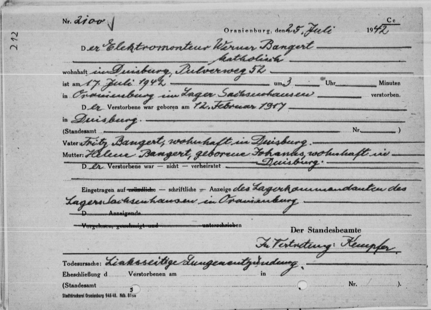 Werner Bangert, geboren am 12. Februar 1917 und wohnhaft in Duisburg bei den Eltern im Pulverweg 52. Vom Beruf war er Elektriker.