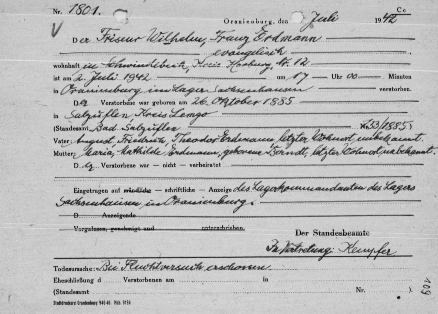 Der Ledige wohnte später in Swindebeck im Kreis Harburg im heutigen Niedersachsen und war von Beruf Friseur.