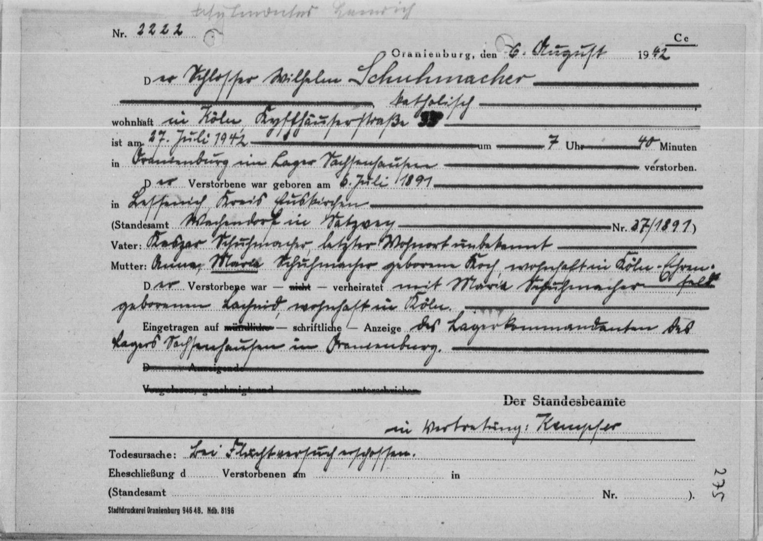 Etwa im Juni 1942 deportierte man ihn in das KZ Sachsenhausen, wo ihn die SS als "§175-Häftling" einstufte und er als "Rosa-Winkel-Häftling" die Häftlingsnummer 43.240 erhielt. Wilhelm Schumacher wurde am 27. Juli 1942 im Alter von 51 Jahren im Außenlager Klinkerwerk ein Opfer